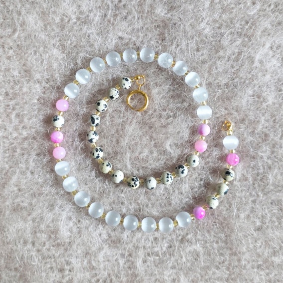 Biżuteria wykonana z kamieni naturalnych, składająca się z małych elementów (koralików, zawieszek). Produkt jest ręcznie robiony, co nadaje mu unikalny charakter.